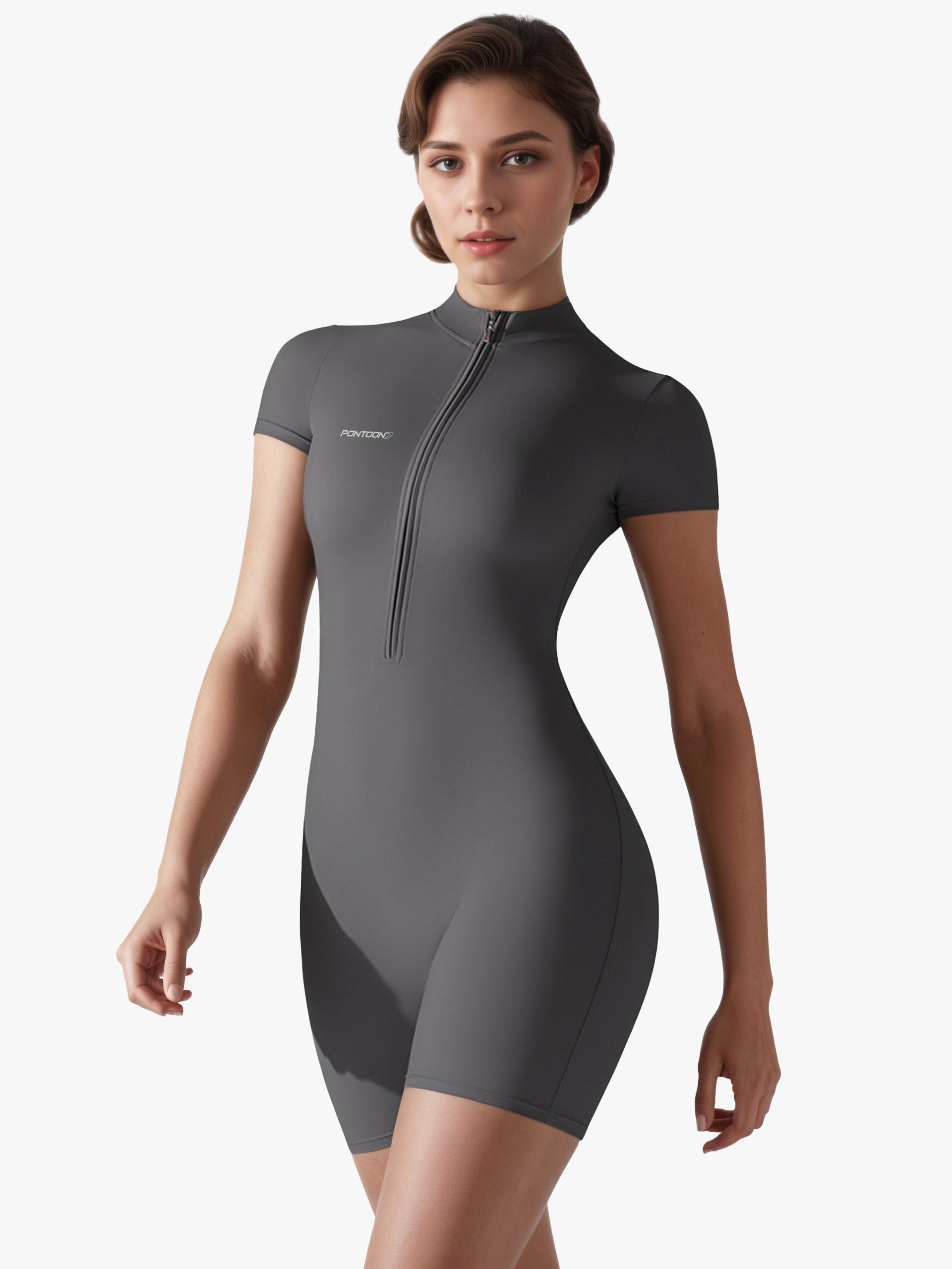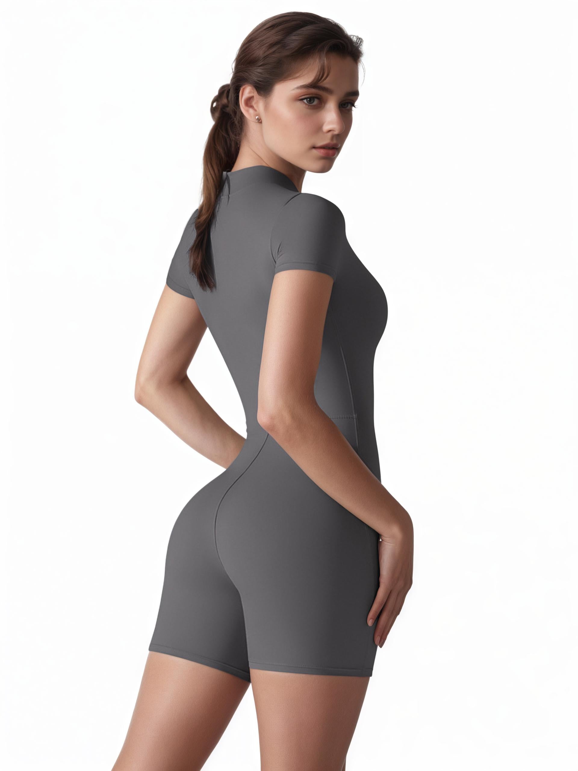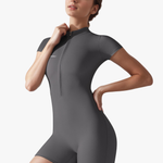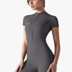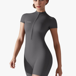 This short-sleeve bodysuit is made from high-performance stretch fabric, it delivers a second-skin fit that enhances your natural shape without restricting movement. The minimalist front-zip design adds function and edge, making it your go-to piece for workouts, layering, or everyday wear.